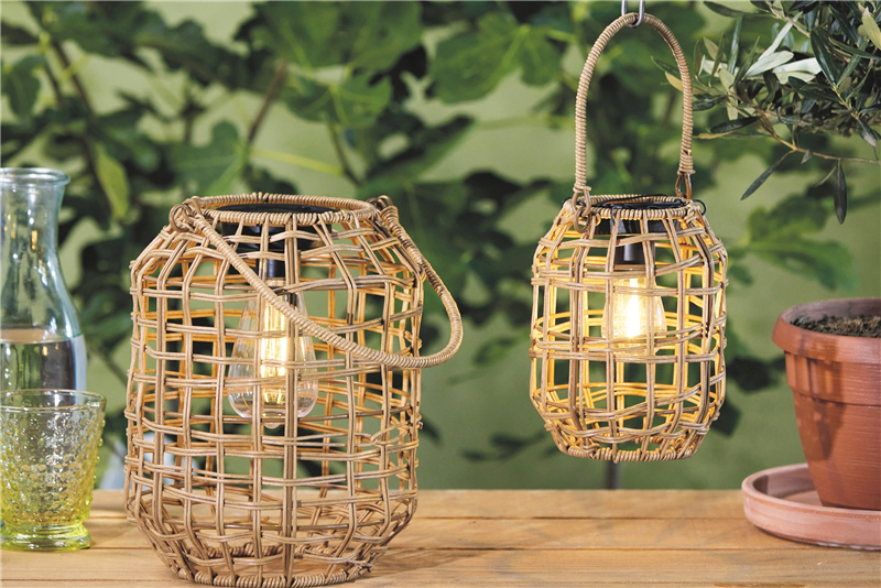 Geflochtene SOLAR-LATERNEN sorgen am Abend für warmes Licht. Zum Stellen oder Hängen, ganz ohne Kabel.