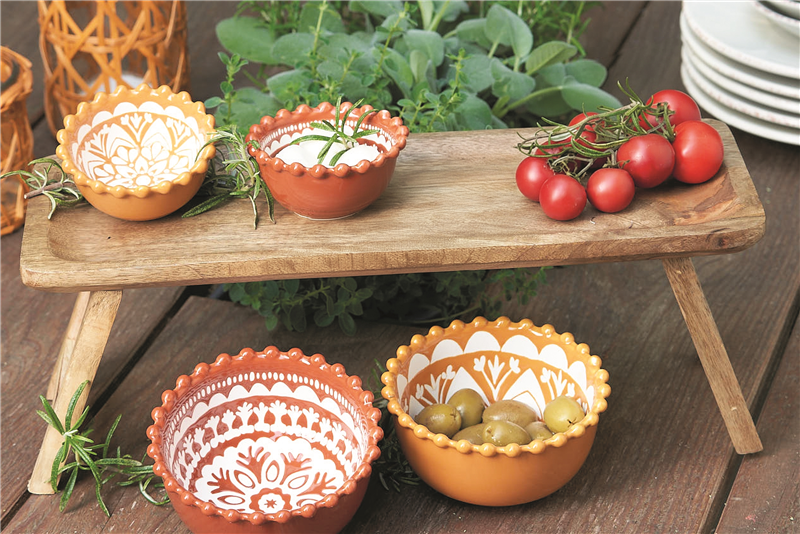 Das TABLETT aus Mangoholz bringt natürliche Wärme auf den Tisch und sorgt für eine schöne Staffelung von Dips, Kräutern oder Antipasti. Die SCHäLCHEN in Terrakotta oder Ocker setzen mediterrane Akzente und eignen sich ideal für Oliven, Salz oder kleine Beilagen.