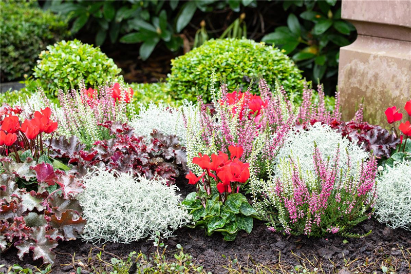 Immergrüne Pflanzen wie die Zwergformen von Koniferen, aber auch Buchs, Spindelsträucher oder Efeu stehen dem