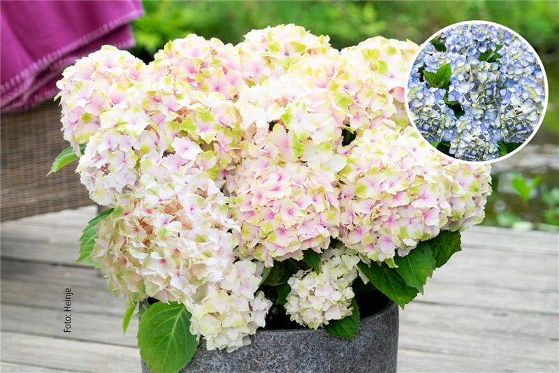 Unterschiedliche Blütenfarben im Laufe des Jahres sind schon etwas einmaliges. Mit dieser Besonderheit punktet die Hortensie 'Switch®' (Hydrangea paniculata). Ihre Blütenfarbe ändert sich im Laufe ihrer Blütezeit mehrmals. Den Auftakt macht ein leichtes Limonengelb, das sich anschließend in ein Weiß und dann in ein wunderbares Altrosa verwandelt. Zum Schluss verweilen rotfarbene Blütenstände an der Pflanze. Blütezeit ist von Juli bis September. Ein ähnlich intensives Farbspiel zaubert die blaue Sorte 'Alchemia' auf die Terrasse.