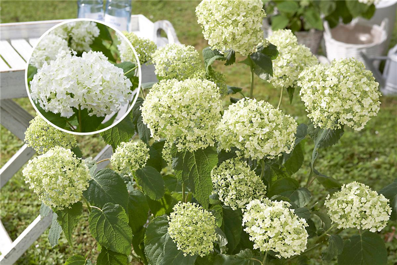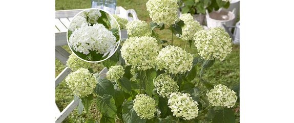 Ballhortensien (Hydrangea arborescens) sind auch unter dem Namen Waldhortensien oder Strauchhortensien bekannt. Im Allgemeinen ist ihr Wuchs kleiner als bei den Bauernhortensien. Die Blüten sind, wie der Name es schon verrät, kugelrund und dicht gefüllt. Zu der bekanntesten Ballhortensie zählt die Sorte 'Annabelle'. Sie ist eine wunderschöne und blühfreudige Sorte, die Sie mit großen weißen Blüten, mit einem Durchmesser von 20 bis 25 cm, von Juni bis September erfreut. Der Legende nach wurde sie 1910 bei einem Ausritt von Harriet Kirkpatrick, der damaligen Inhaberin der Steingut-Manufaktur Anna Pottery, entdeckt. Sie pflanzte das Fundstück in den Garten des Firmengeländes im südlichen Illinois. Erst viel später, nach 50 Jahren, wurde ein Mitarbeiter der Universität auf die Hortensie aufmerksam und taufte sie auf den Namen „Annabelle“.