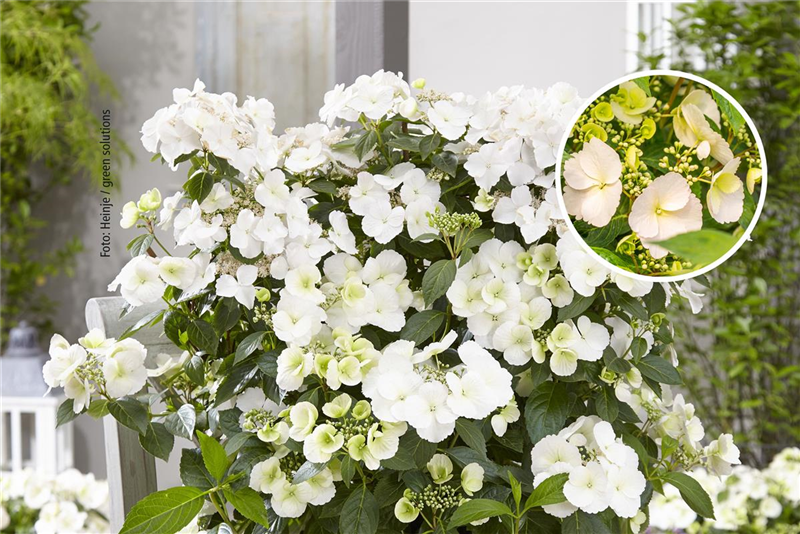 Die winterharte Girlanden-Hortensie 'Runaway Bride®' (Hydrangea macrophylla) ist ein neuer Star und ein Muss für alle Hortensien-Liebhaber. Sie stammt aus Asien und blüht nicht nur an den Triebspitzen, sondern auch an den Seitentrieben von Juni bis September in Schneeweiß. Dadurch sieht ein Trieb wie eine Blütengirlande aus. Diese Sorte lässt sich sowohl im Kübel als auch im Beet kultivieren.