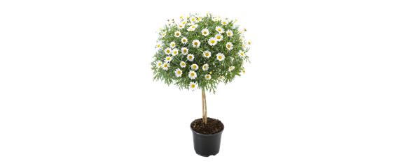 Das weißblühende Margeriten-Stämmchen (Argyranthemum frutescens) sorgt für ausgelassene Stimmung an einem sonnigen bis halbschattigen Standort. Regelmäßige