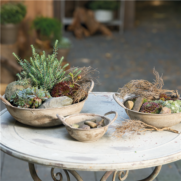 Besonders auffällig und schön sind die verschiedenen Hauswurz-Arten in der grauen Pflanzschale. Spielen Sie mit verschiedenen Schalengrößen und natürlichen Elementen wie Steinen, Zweigen oder Tannenzapfen, das sorgt für Abwechslung.